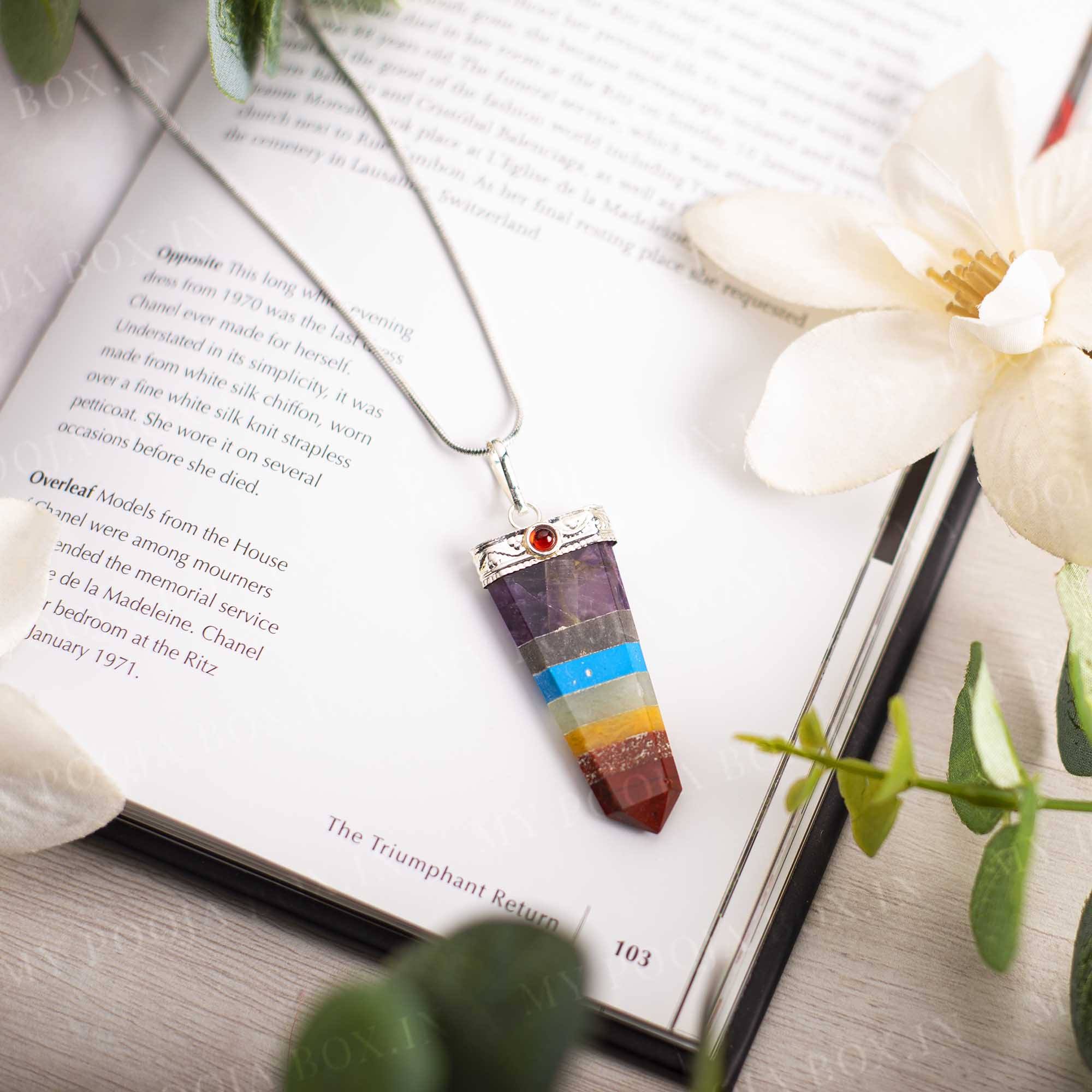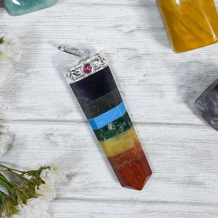 Introducing our premium 7 Chakra Bonded Stone Pendant. Each stone is carefully selected and bonded together, creating a luxurious and unique piece. Balance your mind, body, and spirit with the power of the 7 chakras. Elevate your style and well-being with this exquisite pendant.