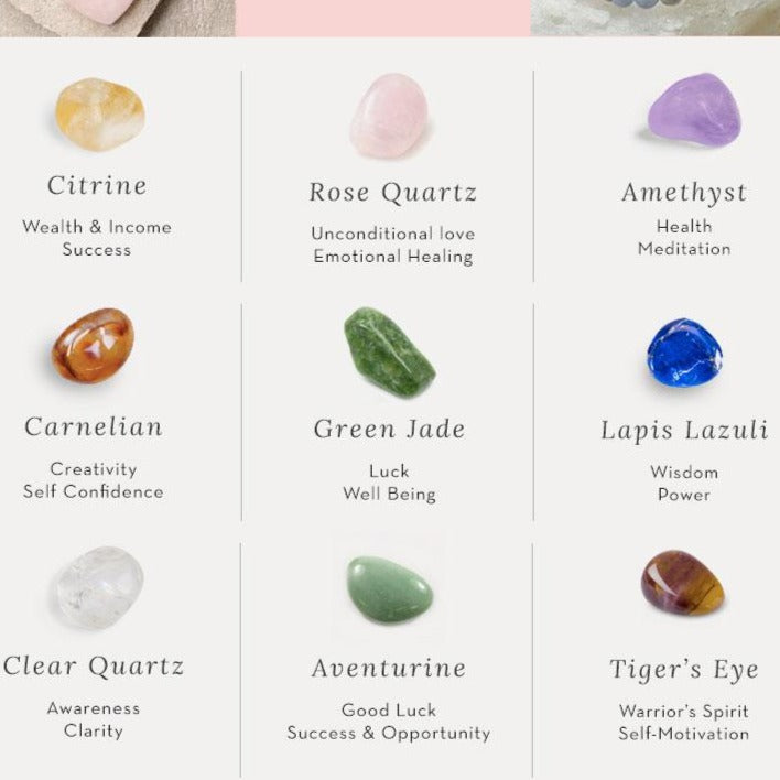 7 chakra. It includes crystals: (i) Amethyst (ii) Sodalite (iii) Lapis Lazuli (iv) Green Aventurine (v) Tiger Eye (vi) Carnelian (vii) Red Jasper.