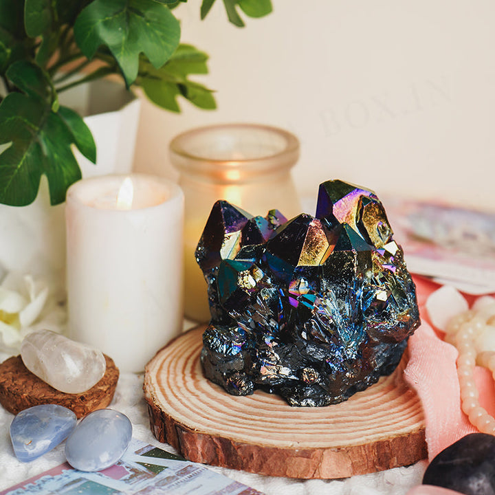 Enhance your sense of calm and inner peace with our Angel Aura Cluster. This beautiful crystal cluster features natural rainbow hues and is known for its ability to alleviate anxiety and promote spiritual growth. Perfect for meditation or as a decorative piece, add some positive energy to your space with our Angel Aura Cluster.