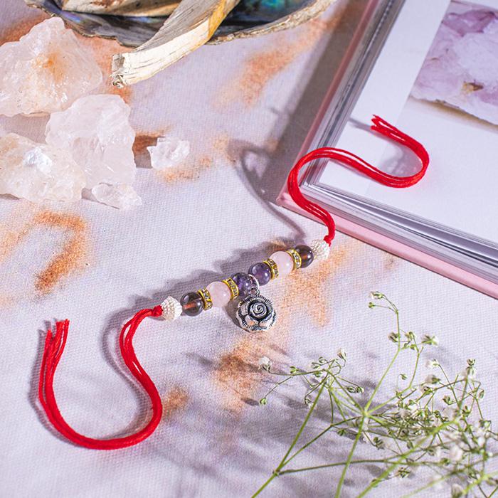 Introducing our Black Onyx and Rose Quartz Beaded Crystal Rakhi with Charm, a luxurious and exclusive piece that combines the healing properties of black onyx and rose quartz crystals with the traditional Indian Rakhi. This elegant and tasteful rakhi is the perfect way to show your love and appreciation to your sibling.