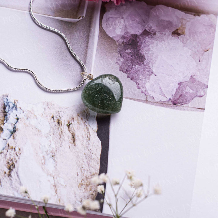 The Green Aventurine Heart Pendant Necklace is expertly crafted with genuine green aventurine stone. Its heart-shaped pendant is not only aesthetically pleasing, but also carries healing and balancing properties. This necklace is a perfect addition to your collection of natural stone jewelry.