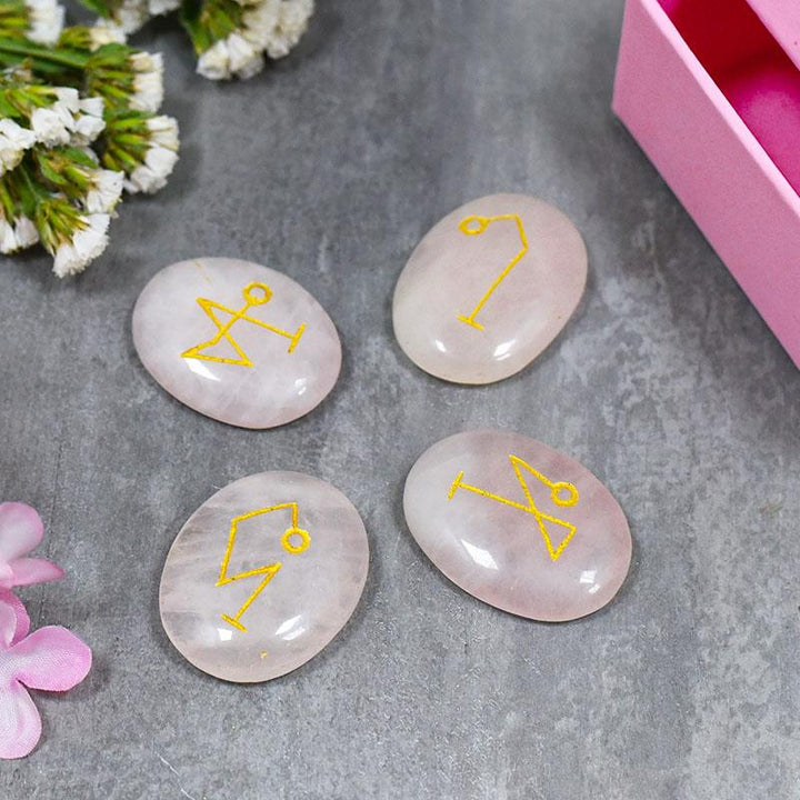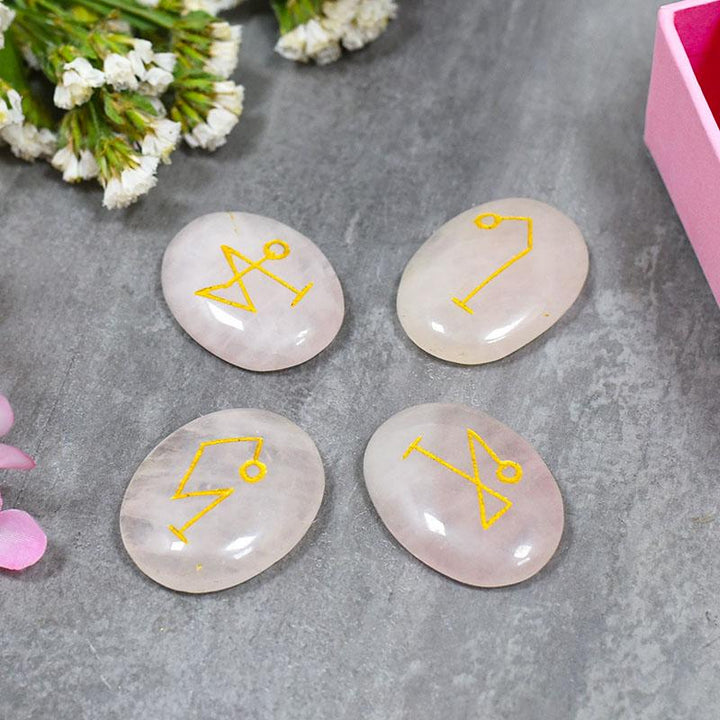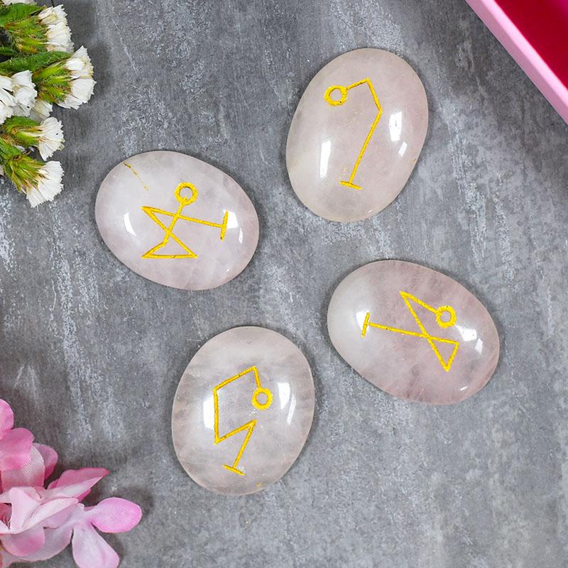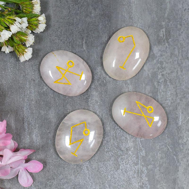 Introducing our Rose Quartz Arch Angel Engraved Set! Enhance your spiritual journey with these beautifully engraved stones. Each set includes four arch angel engravings, bringing peace, love, and protection into your life. A perfect addition to any meditation or crystal collection.